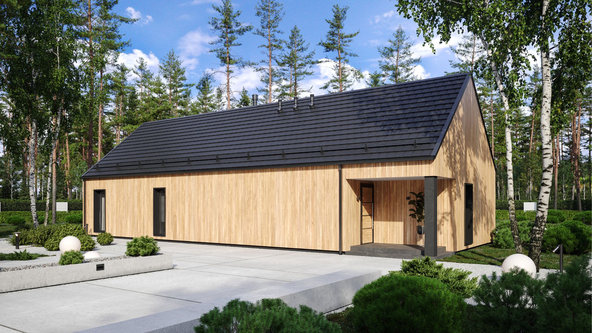 Dom oferuje 3 przestronne pokoje oraz 2 komfortowe łazienki, zapewniając optymalne warunki zarówno dla par, jak i rodzin z dziećmi. Wyjątkowym atutem projektu jest imponująca strefa dzienna o powierzchni aż 57,15 m², która stanowi serce domu i perfekcyjne miejsce spotkań domowników.