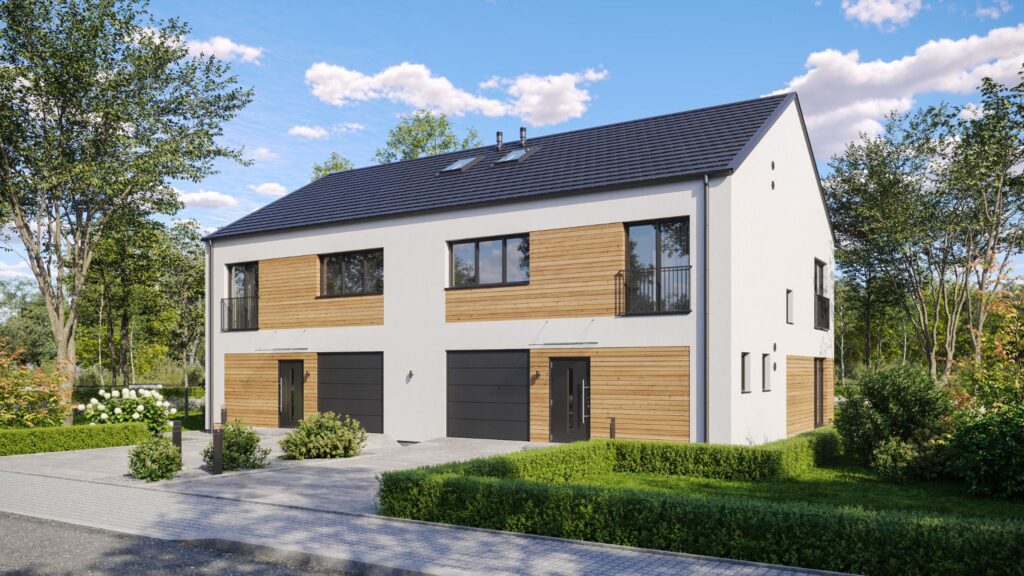 Projekt Duo to nowoczesny dom w zabudowie bliźniaczej, zaprojektowany jako dwa pełnowartościowe, lustrzane segmenty, z których każdy stanowi samodzielny, funkcjonalny dom. To rozwiązanie doskonale sprawdzi się zarówno jako komfortowe miejsce do życia dla dwóch rodzin, jak i jako atrakcyjna inwestycja deweloperska.