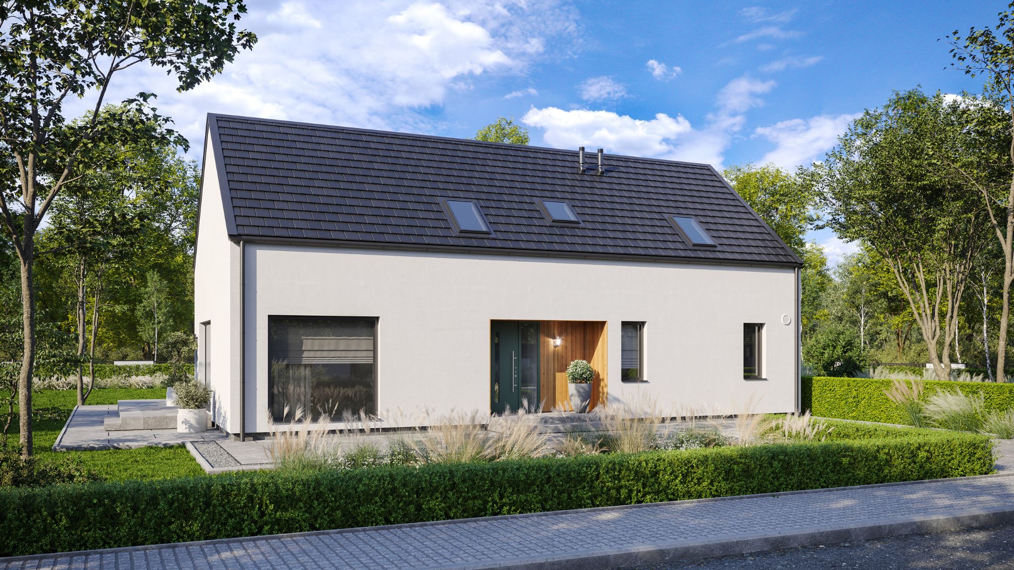 - Stolarka okienna: Kömmerling 76 MD biały-antracyt, parapety zewnętrzne, parapety wewnętrzne
