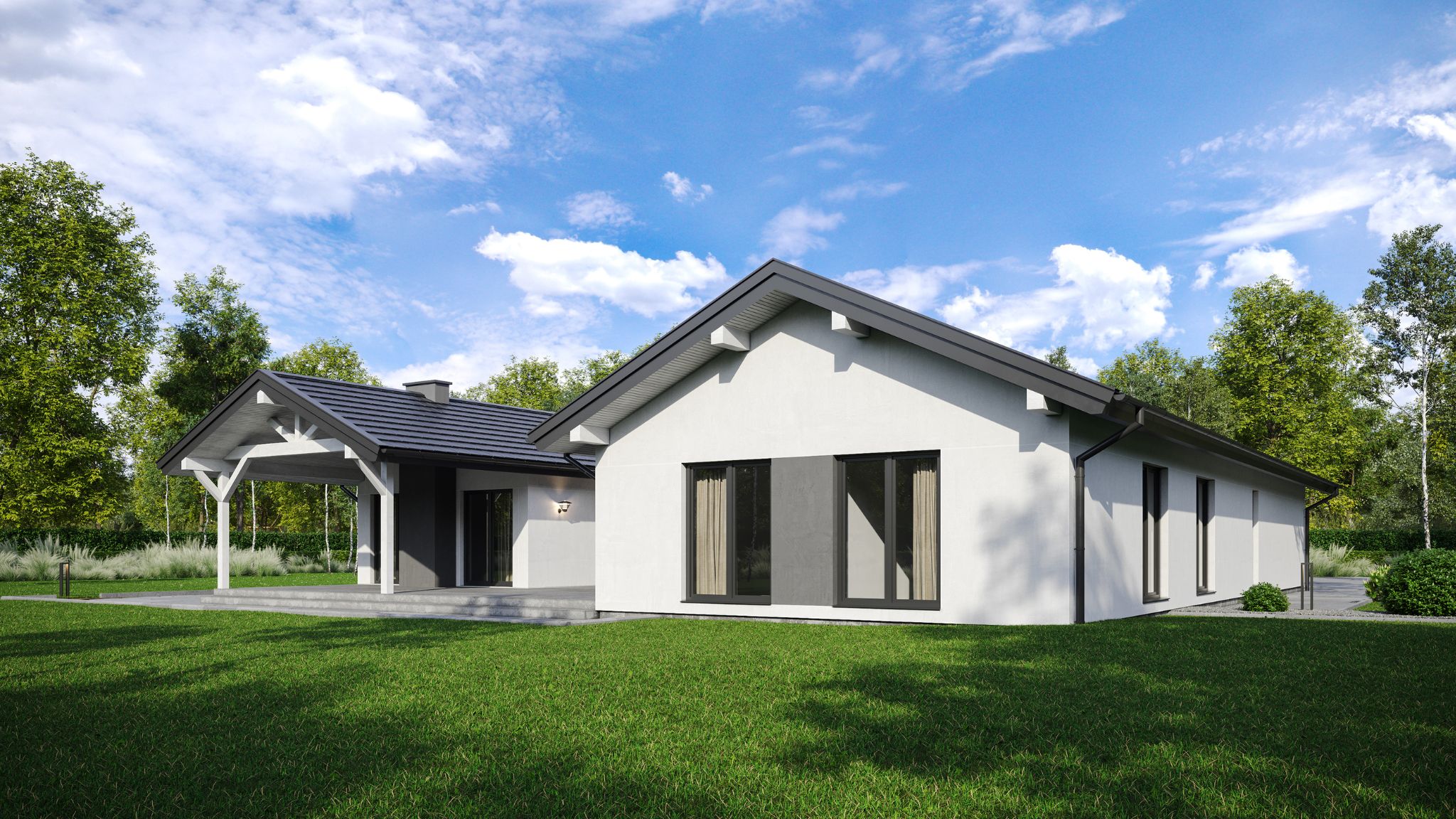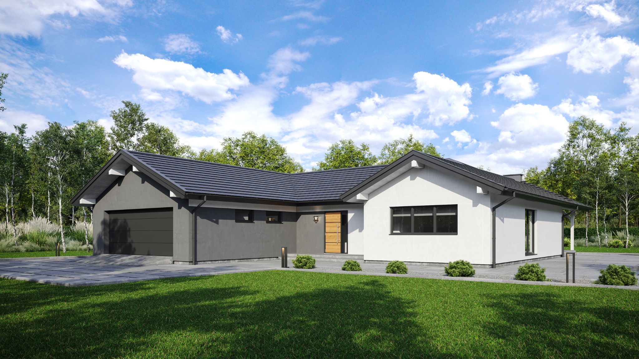 Projekt przewiduje garaż dwustanowiskowy, zapewniający wygodę parkowania oraz dodatkową przestrzeń gospodarczą. Klasyczny dach dwuspadowy podkreśla ponadczasowy charakter budynku i doskonale wpisuje się zarówno w nowoczesne, jak i tradycyjne otoczenie.
